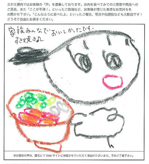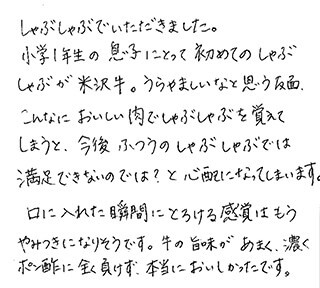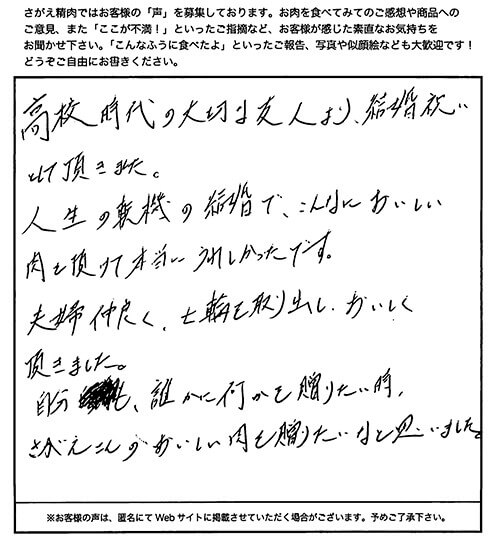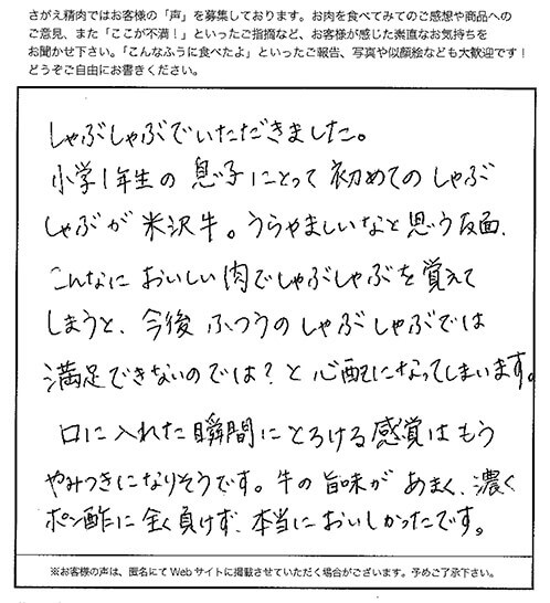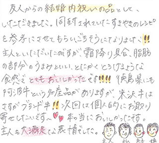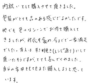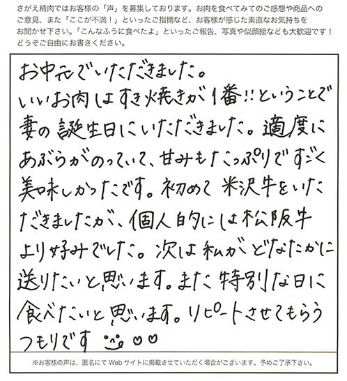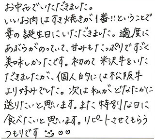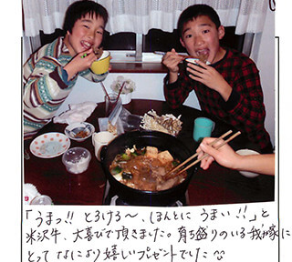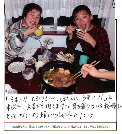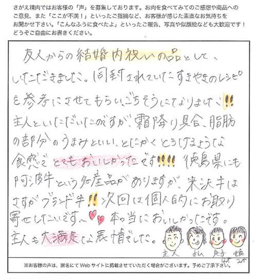 友人からの結婚内祝いの品として、いただきました。 同封されていたすきやきのレシピを参考にさせてもらい、ごちそうになりました!! 主人といただいたのですが、霜降り具合、脂肪の部分のうまみといい、とにかくとろけるような食感でとてもおいしかったです!!!! 徳島県にも阿波牛という名産品がありますが、米沢牛はさすがブランド牛!! 次回は個人的にお取り寄せしたいです。本っ当においしかったです。 主人も大満足な表情でした。