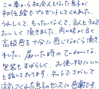 この春から社会人となった息子が初任給でプレゼントしてくれました。うれしくて、もったいなくて、主人と3人でおいしく頂きました。肉の味が良く高級感を十分に感じながら頂きました。届いた時のていねいな包装もすばらしく、お使い物にいいね。と話しております。ネットでさがして注文してくれた息子のセンスに感謝です。