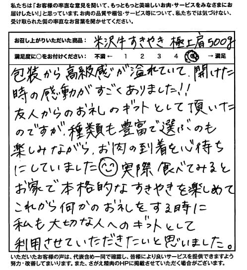 包装から高級感が溢れていて、開けた時の感動がすごくありました!! 友人からのお礼のギフトとして頂いたのですが、種類も豊富で選ぶのも楽しみにしたがら、お肉の到着を心待ちにしていました。実際食べてみるとお家で本格的なすきやきを楽しめてこれから何かのお礼をする時に私も大切な人へのギフトとして利用させていただきたいと思いました。