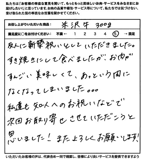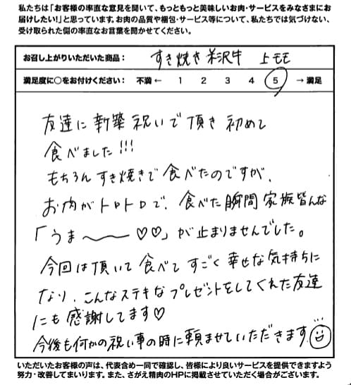 友人に新築祝いとしていただきました。すき焼きにして食べましたが、お肉がすんごい美味しくて、あっという間になくなってしまいました…私達も知人へのお祝いなどで次回お取り寄せさせていただこうと思いました!またよろしくお願いします!