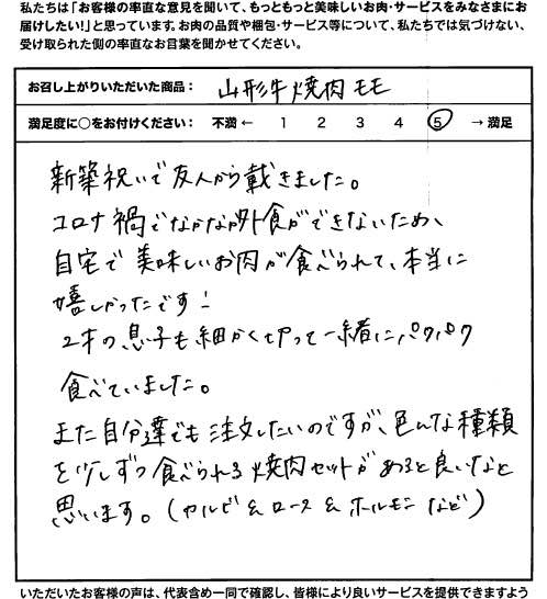 新築祝いで友人から戴きました。コロナ禍でなかなか外食ができないため、自宅で美味しいお肉が食べられて、本当に嬉しかったです。2歳の息子も細かく切って一緒にパクパク食べていました。また自分たちでも注文したのですが、色んな種類を食べられる焼肉セットがあればいいなと思います。(カルビ&ロース&ホルモンなど)