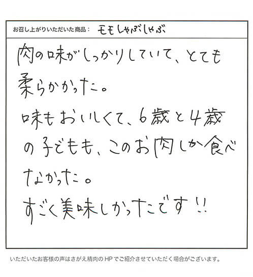 肉の味がしっかりしていて、とても柔らかかった。味もおいしくて、6歳と4歳の子どもも、このお肉しか食べなかった。すごく美味しかったです!!