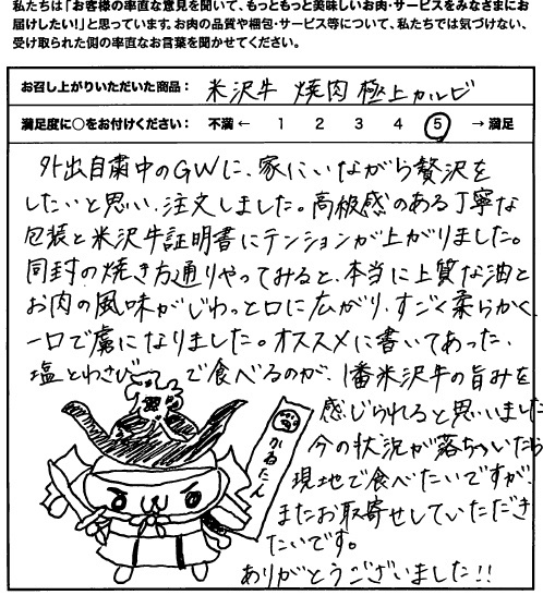 外出自粛中のGWに、家にいながら贅沢をしたいと思い、注文しました。高級感のある丁寧な包装と米沢牛証明書にテンションが上がりました。同封の焼き方通りやってみると、本当に上質な油とお肉の風味がじわっと口に広がり、すごく柔らかく一口で虜になりました。オススメに書いてあった塩とワサビで食べるのが一番米沢牛の旨味を感じられると思いました。今の状況が落ち着いたら現地で食べたいですが、またお取り寄せしていただきたいです。ありがとうございました!