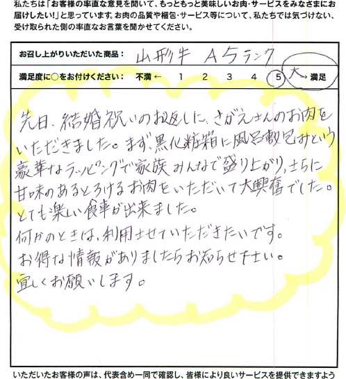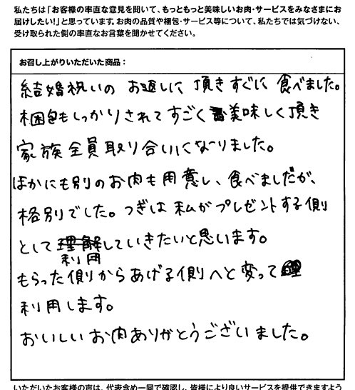 ここで実際に結婚式の内祝いでさがえ精肉のお肉をもらったお客様の声をご紹介します。