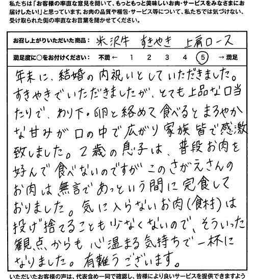 年末に、結婚の内祝いとしていただきました。すきやきでいただきましたが、とても上品な口当たりで、わり下・卵と絡めて食べるとまろやかな甘味が口の中で広がり家族皆で感激いたしました。2歳の息子は、普段お肉を好んで食べないのですが、このさがえさんのお肉は無言であっという間に完食しておりました。気に入らないお肉(食材)は投げ捨てることも少なくないので、そういった観点からも心温まる気持ちで一杯になりました。ありがとうございます。