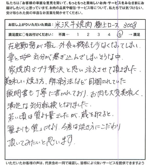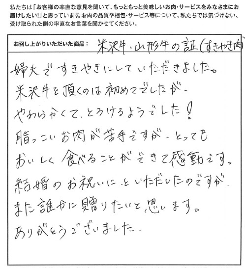 夫婦ですきやきにしていただきました。米沢牛を頂くのは初めてでしたが、柔らかくて、とろけるようでした!脂っこいお肉が苦手ですが、とってもおいしく食べることができて感動です。結婚のお祝いに、といただいたのですが、また誰かに贈りたいと思います。ありがとうございました。