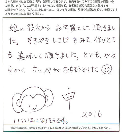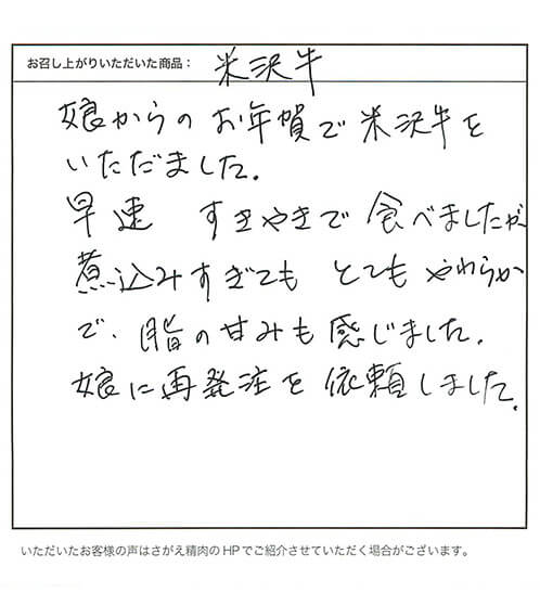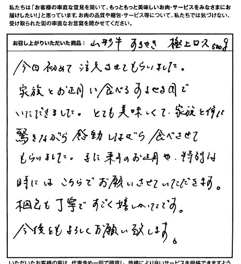 今回初めて注文させてもらいました。家族とお正月に食べるすきやき用でいただきました。とても美味しくて、家族と共に驚きながら感動しながら食べさせてもらいました。また来年のお正月や特別な時にはこちらでお願いさせていただきます。梱包も丁寧ですごく嬉しかったです。今後ともよろしくお願い致します。