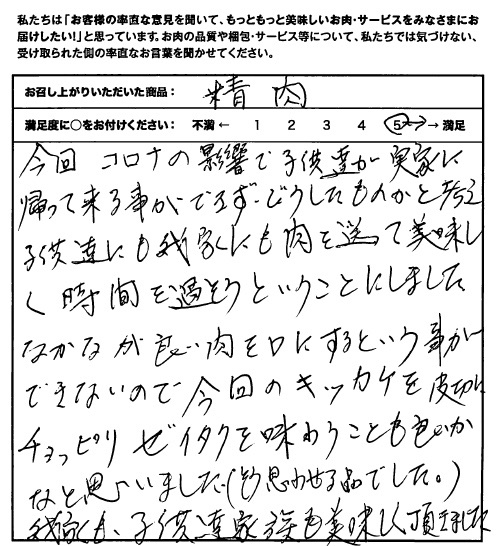 今回のコロナの影響で子供達が実家に帰って来る事ができず、どうしたものかと考え、子供達にも我家にも肉を送って美味しく時間を過ごそうということにしました。なかなか良い肉を口にするという事ができないので、今回のキッカケを皮切りにちょっぴり贅沢を味わうこともいいかなと思いました(そう思わせる品でした)。我家も、子供達家族も美味しく頂きました。
