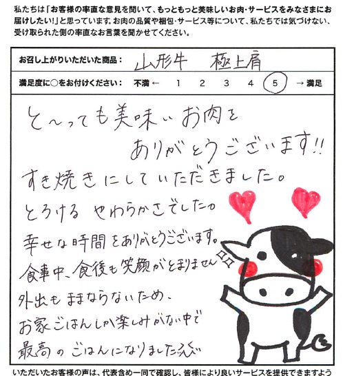 と〜っても美味いお肉をありがとうございます!!すき焼きにしていただきました。とろけるやわらかさでした。幸せな時間をありがとうございます。食事中、食後も笑顔がとまりません。外出もままならないため、お家ごはんしか楽しみがない中で最高のごはんになりました。