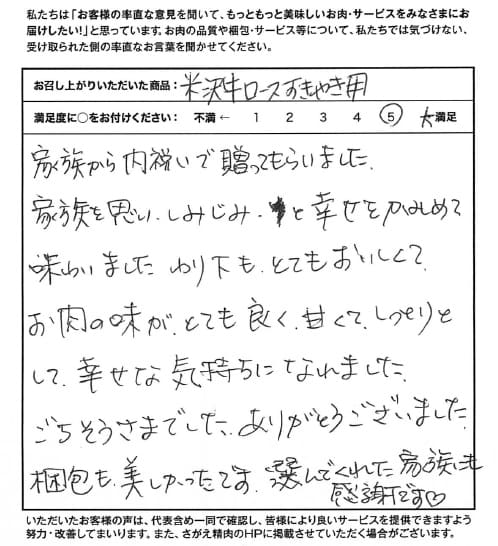 家族から内祝いで贈ってもらいました。 家族を思いしみじみと幸せをかみしめて味わいました。わり下も、とてもおいしくて、お肉の味が、とても良く、甘くて、しっかりとして幸せな気持ちになれました。ごちそうさまでした。ありがとうございました。梱包も美しかったです。選んでくれた家族にも感謝です♡