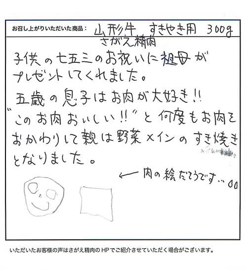 子供の七五三のお祝いに祖母がプレゼントしてくれました。五歳の息子はお肉が大好き!!"このお肉おいしい!!"と何度もお肉をおかわりして親は野菜メインのすき焼きとなりました。“