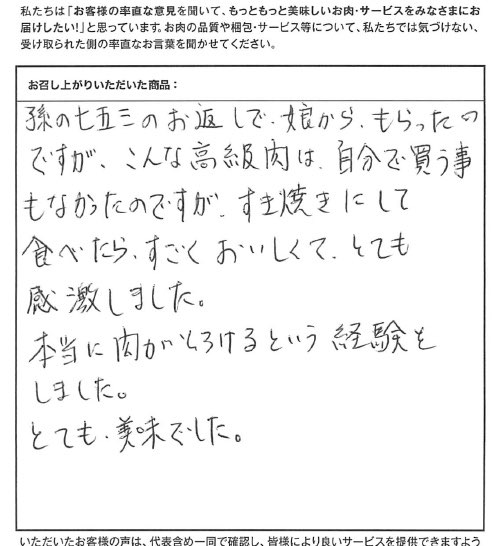 孫の七五三のお返しで、娘からもらったのですが、こんな高級肉は自分で買う事もなかったのですが、すき焼きにして食べたらすごくおいしくて、とても感激しました。本当に肉がとろけるという経験をしました。とても美味でした。