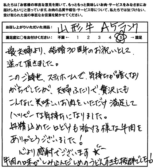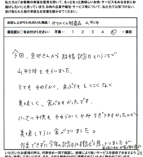 今回、旦那さんから結婚記念日ということで山形牛をもらいました。とてもやわらかく、あぶらもしつこくなく美味しく、食べやすかったです。小さい子供もやわらかくかみちぎりやすかったのか、美味しそうに食べていました。外出できずに今年の記念日は残念だと思っていましたが、美味しいものが食べれて良かったです。