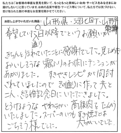 希望していた通り、◯日以降でというお願いがきちんと伝わっていたことに感謝でした。見た目もおいしそうな霜降りのお肉にテンションが上がりました。すきやきレシピが同封されていましたので、その通りに作って夫と二人、結婚記念日にいただきました。とろけるようなやわらかい高級肉をたんのういたしました。スーパーのいつものすき焼きとは大違いでした。ごちそうさまでした。