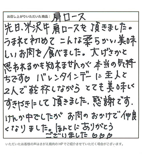 先日、米沢牛肩ロースを頂きました。うまれて初めてこんな柔らかい美味しいお肉を食べました。大げさかと思われるかも知れませんが本当の気持ちです♡バレンタインデーに主人と2人で乾杯しながらとても美味しくすきやきにして頂きました。感謝です。けんか中でしたがお肉のおかげで仲良くなりました。ほんとにありがとうございました♡♡♡