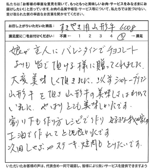 娘が主人にバレンタインでチョコレートよりも皆で頂ける様に贈ってくれました。大変美味しく頂きました。以前シャトーブリアン山形牛を頂き、山形牛の美味しさはわかっていました。やはりとても美味しいです。 割り下も作り方レシピで作り、好きな我が家の正油で作れてとても良かったです。 次回しゃぶしゃぶやステーキ、焼肉もとりたいです。