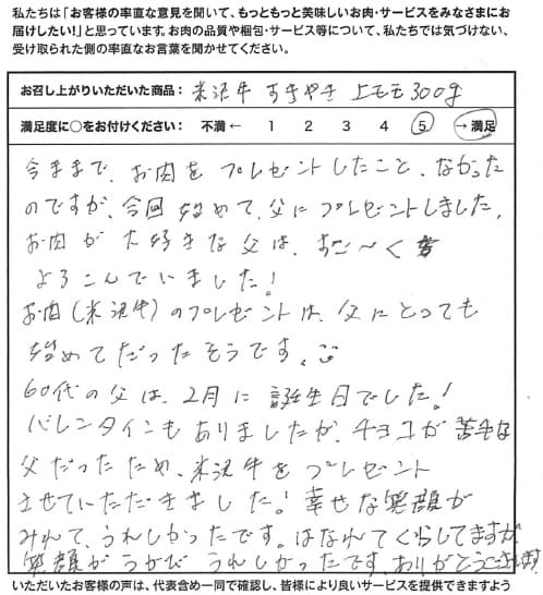 今までお肉をプレゼントしたことなかったのですが、今回初めて父にプレゼントしました。 お肉が大好きな父は、すご〜くよろこんでいました! お肉(米沢牛)のプレゼントは、父にとっても初めてだったそうです^^ 60代の父は2月に誕生日でした!バレンタインもありましたが、チョコが苦手な父だっため、米沢牛をプレゼントさせて頂きました! 幸せな笑顔が見れて、嬉しかったです。はなれてくらしてますが、笑顔が浮かびうれしかったです。ありがとうございます。