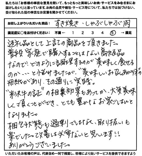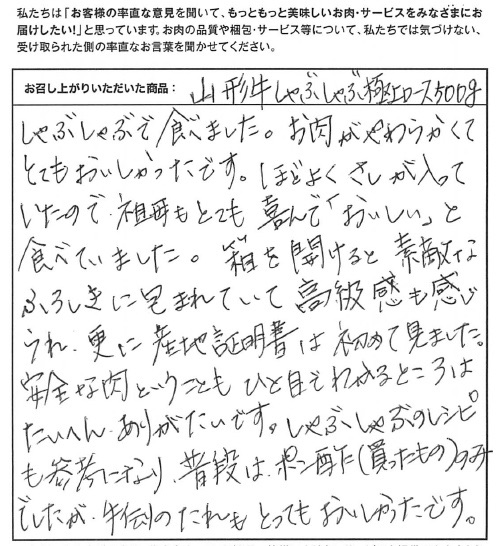結婚内祝としていただきました。こんなにいい肉を食べたことのない母(92才)は、とても喜んでいました。レシピ等もあり、本当においしくいただきました。山形牛の産地証明書まで添付され安心していただくことができました。お祝を届けてくださった方と、「さがえ」様にありがとう♡