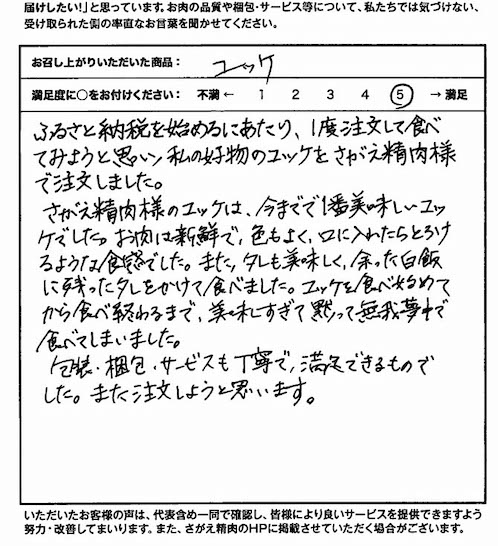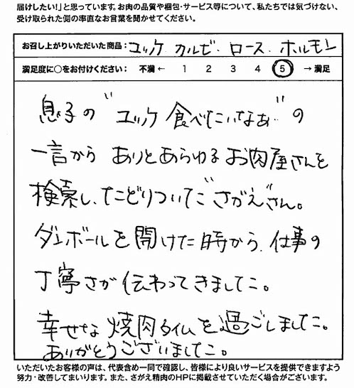 息子の”ユッケ食べたいなぁ...”の一言からありとあらゆるお肉屋さんを検索し、たどりついた”さがえ”さん。ダンボールを開けた時から仕事の丁寧さが伝わってきました。幸せな焼肉タイムを過ごしました。ありがとうございました。
