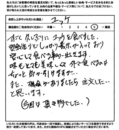すごく久しぶりにユッケを食べました。 安全性などしっかり表示が入っており、安心して食べることが出来ます。 味もとてもおいしくて、外で食べるのがちょっと気が引けますが... また、機会がありましたら注文したいと思います。 (今回は頂き物でした。)