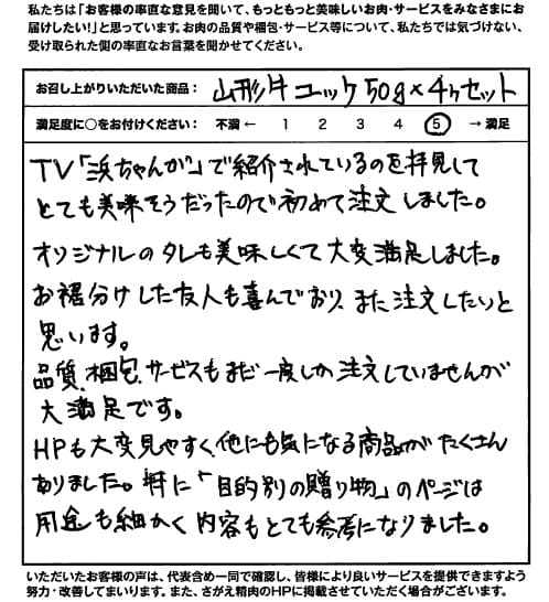 TV「浜ちゃんが」で紹介されているのを拝見してとても美味しそうだったので初めて注文しました。 オリジナルのタレも美味しくて大変満足しました。 お裾分けした友人も喜んでおり、また注文したいと思います。 品質、梱包、サービスもまだ一度しか注文していませんが大満足です。 HPも大変見やすく他にも気になる商品がたくさんありました。特に「目的別の贈り物」のページは用途も細かく内容もとても参考になりました。