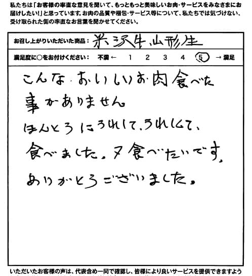 こんなおいしいお肉食べた事ありません。 ほんとうにうれしくてうれしくて食べました。 又食べたいです。 ありがとうございました。