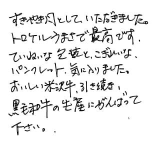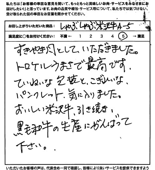 すきやき用として、いただきました。トロケルうまさで最高です。ていねいな包装と、こぎれいな、パンフレット、気に入りました。おいしい米沢牛、引き続き、黒毛和牛の生産にがんばって下さい。