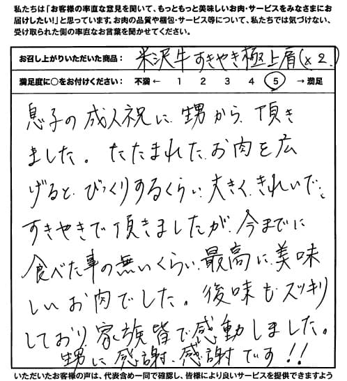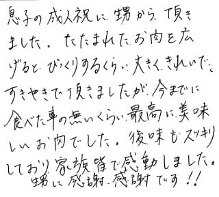 息子の成人祝に、甥から、頂きました。たたまれたお肉を広げると、びっくりするくらい大きく、きれいで、すきやきで頂きましたが、今までに食べた事の無いくらい、最高に美味しいお肉でした。後味もスッキリしており、家族皆で感動しました。甥に感謝、感謝です!!