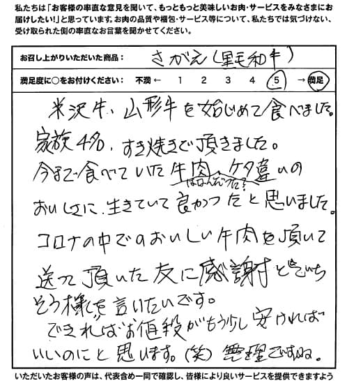米沢牛、山形牛を初めて食べました。家族4名、すき焼きで頂きました。今まで食べていた牛肉はなんだった?ケタ違いのおいしさに、生きていて良かったと思いました。コロナの中でのおいしい牛肉を頂いて送って頂いた友に感謝とごちそう様を言いたいです。 できればお値段がもう少し安ければいいのにと思います。 (笑)無理ですね。