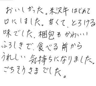 おいしかった。米沢牛はじめて口にしました。甘くて、とろける味でした。梱包もかわいい風呂敷で、食べる前からうれしい気持ちになりました。ごちそうさまでした。