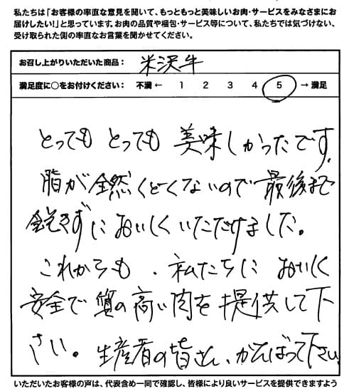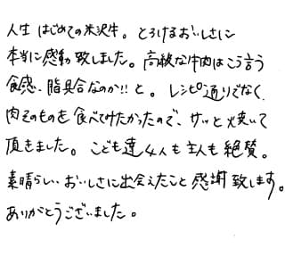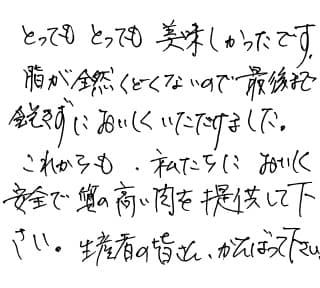 とってもとっても美味しかったです。脂が全然くどくないので最後まで飽きずにおいしくいただけました。これからも、私たちにおいしく安全で質の高い肉を提供して下さい。生産者の皆さん、がんばって下さい。