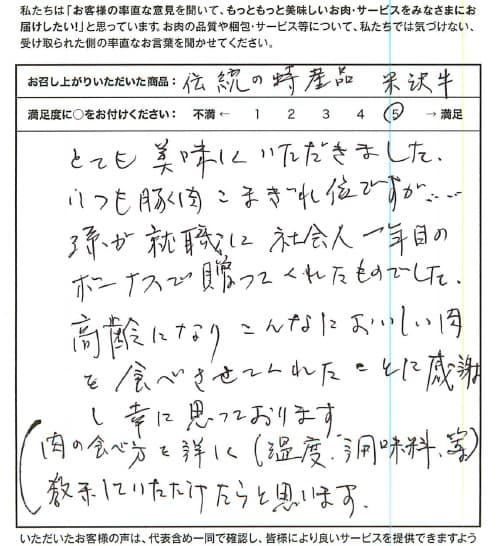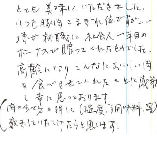 とても美味しくいただきました。いつも豚肉こまぎれ位ですが…孫が就職に社会人一年目のボーナスで贈ってくれたものでした。高齢になりこんなにおいしい肉を食べさせてくれたことに感謝し幸に思っております。(肉の食べ方を詳しく(温度・調味料等)教示していただけたらと思います)