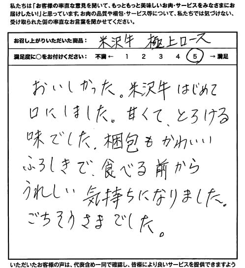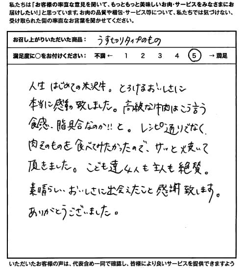 人生はじめての米沢牛。とろけるおいしさに本当に感動致しました。高級な牛肉はこう言う食感、脂具合なのか!!と。レシピ通りでなく、肉そのものを食べてみたかったので、サッと焼いて頂きました。こども達4人も主人も絶賛。素晴らしいおいしさに出会えたこと感謝致します。ありがとうございました。
