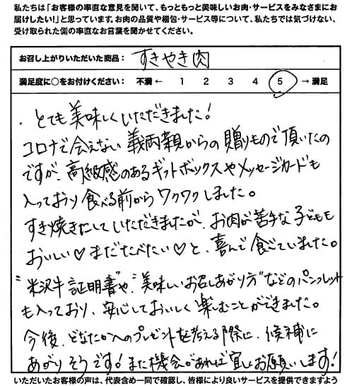 とても美味しくいただきました!コロナで会えない義両親からの贈りもので頂いたのですが、高級感のあるギフトボックスやメッセージカードも入っており食べる前からワクワクしました。すき焼きにしていただきましたが、お肉が苦手な子どももおいしい♡まだたべたい♡と、喜んで食べていました。”米沢牛証明書”や”美味しいお召しあがり方”などのパンフレットも入っており、安心しておいしくおいしく楽しむことができました。今後、どなたかへのプレゼントを考える際に、候補にあがりそうです!また機会があれば宜しくお願いします!