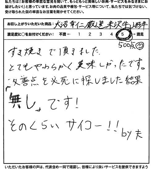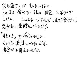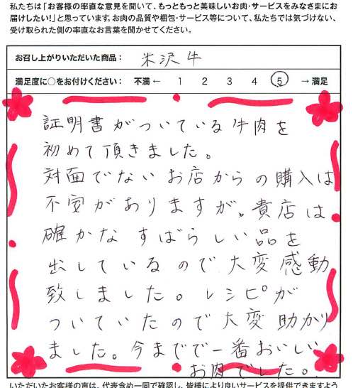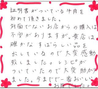証明書がついている牛肉を初めて頂きました。対面でないお店からの購入は不安がありますが、貴店は確かなすばらしい品を出しているので大変感動致しました。レシピがついていたので大変助かりました。今までで一番おいしいお肉でした。