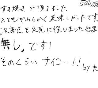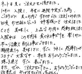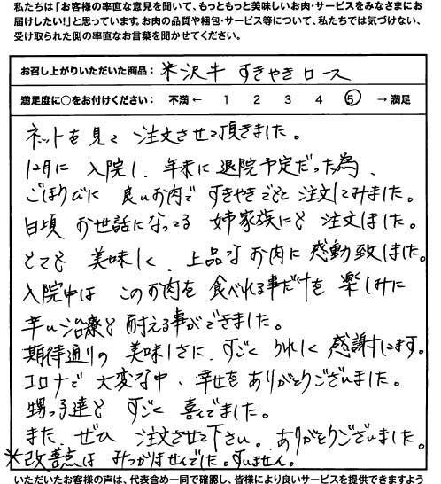 ネットを見て注文させて頂きました。12月に入院し、年末に退院予定だった為、ご褒美に良いお肉ですきやきでもと注文してみました。日頃お世話になっている姉家族にも注文しました。とても美味しく、上品なお肉に感動致しました。入院中はこのお肉を食べれることだけを楽しみに辛い治療も耐えることができました。期待通りの美味しさに、すごくうれしく感謝します。コロナで大変な中、幸せをありがとうございました。甥っ子たちもすごく喜んでました、またぜひ、注文させてください。ありがとうございました。