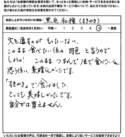 火を通すのがもったいない。このまま食べたい位の肉色と言うのでしょうか。このままつまんで生で食べたいと思う位い、素晴らしかったです。「すきやき」で食べました。とっても美味しかったです。自分では買えません。