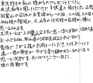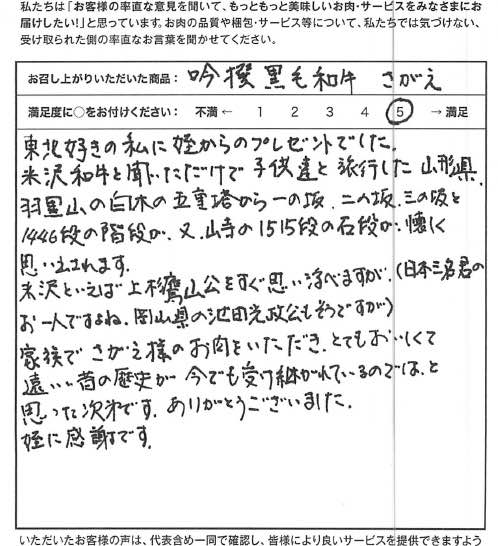 東北好きの私に姪からのプレゼントでした。米沢和牛と聞いただけで、子供たちと旅行した山形県・羽黒山の白木の五重塔から一の坂・二の坂・三の坂と1446段の階段が、また、山寺の1515段の石段が懐かしく思い出されます。米沢といえば、上杉鷲山公をすぐ思い浮かべますが。(日本三名君のお一人ですよね。岡山県の池田光政公もそうですが)家族でさがえ様のお肉をいただき、とてもおいしくて遠い昔の歴史が今でも受け継がれているのでは、と思った次第です。ありがとうございました。姪に感謝です。