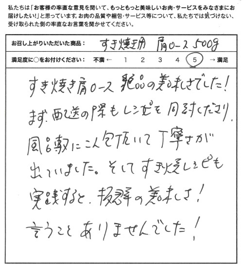 すき焼き肩ロース、絶品の美味しさでした!まず、配送の際もレシピを同封してくださり、風呂敷に梱包いただいて丁寧さが出ていました。そしてすき焼きレシピも実践すると抜群の美味しさ!言うことありませんでした!