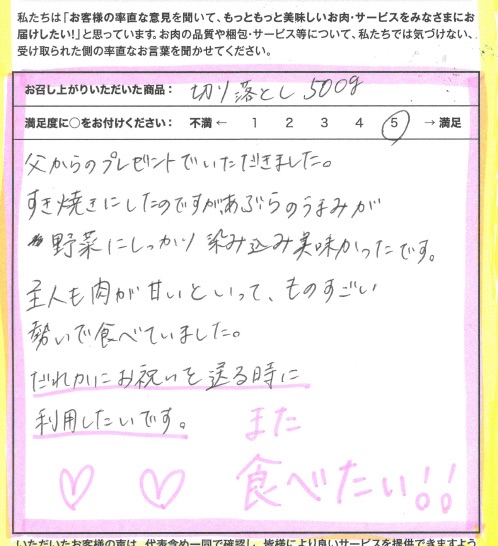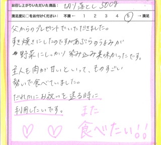 今回は娘から結婚記念日にすき焼きとプレゼントに選んでくれ美味しくいただきました。切落としの肉といえど、美味しかったです。メッセージカードもあり、よかったです。保証書、生産者もわかり安心です。