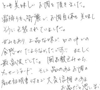 とても美味しいお肉を頂きました。霜降りも綺麗で、お肉自体も美味しそうに包装されていました。甘みもあり、上品な味で口の中での食感がたまらなかったです!!まさしく最高級でした。風呂敷包みからメッセージカード、そして品のあるお肉の産地証明書付きで大変信用のあるお品だと思いました。