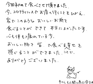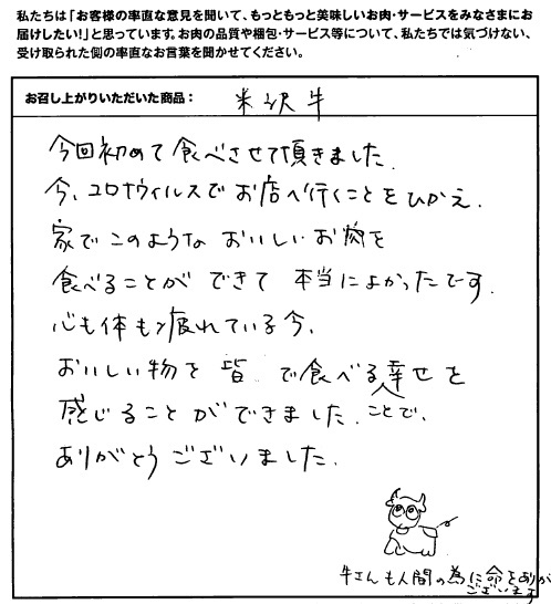 今回初めて食べさせて頂きました。今、コロナウイルスでお店に行くことをひかえ、家でこのようなおいしいお肉を食べることができて本当によかったです。心も体も疲れている今、おいしい物をみんなで食べることで、幸せを感じることができました。ありがとうございました。