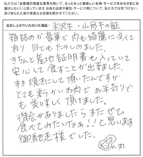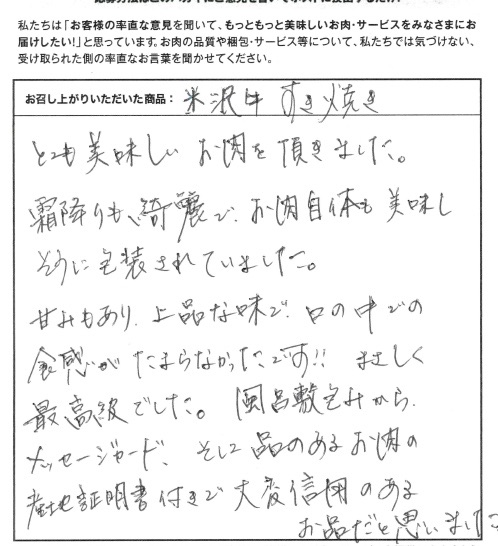 夫婦ですきやきにしていただきました。米沢牛を頂くのは初めてでしたが、柔らかくて、とろけるようでした!脂っこいお肉が苦手ですが、とってもおいしく食べることができて感動です。結婚のお祝いに、といただいたのですが、また誰かに贈りたいと思います。ありがとうございました。