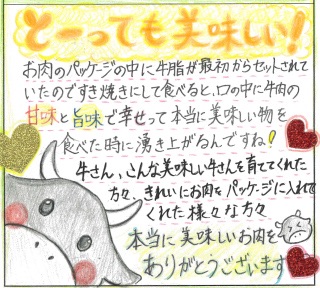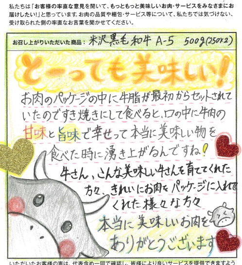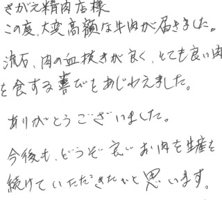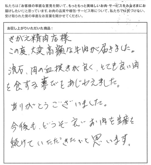 さがえ精肉店様 この度、大変高額な牛肉が届きました。流石、肉の血抜きが良く、とても良い肉を食する喜びをあじわえました。ありがとうございました。今後も、どうぞ良いお肉を生産を続けていただきたいと思います。
