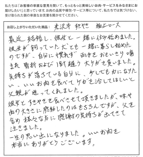 最近結婚し、彼女と一緒に住み始めました。彼女が飼っていた犬とも一緒に暮らし始めたのですが、自分に慣れず両手を思いきり噛まれ骨折および1針縫う大ケガを負いました。気持ちが落ちている自分に、少しでも力になりたい、いいお肉を食べてケガを治してほしいと父親が送ってくれました。彼女とすきやきを食べさせて頂きましたが、味や肉の大きさに感動したのはもちろんですが、父を含め様々な方に感謝の気持ちが出てきて泣きました。一生の思い出になりました。いいお肉を本当にありがとうございます。