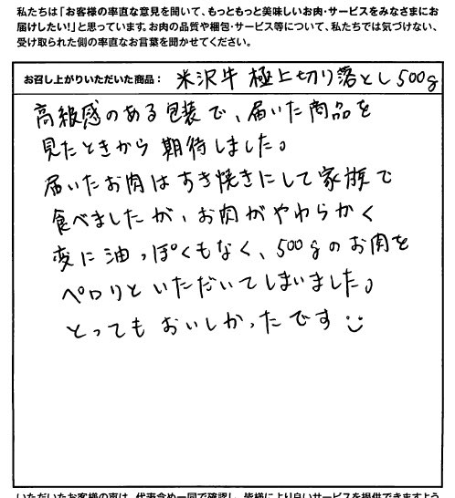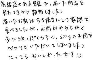 高級感のある包装で、届いた商品を見たときから期待しました。届いたお肉はすき焼きにして家族で食べましたが、お肉がやわらかく変に油っぽくもなく、500gのお肉をペロリといただいてしまいました。とってもおいしかったです。