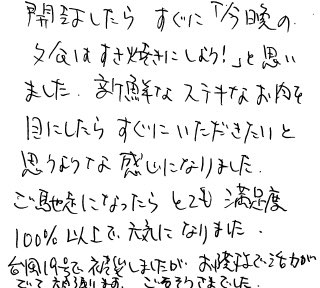 娘が送ってくれ、すき焼きにしていただきました。私共二人は但馬牛を育てている但馬地方の出身で「米沢牛」は名前を聞いたことがある程度でした。82才の認知症の主人はいつも無表情で食べるのですが、ニコニコ顔で「おいしい」と言い、あっという間になくなり、久しぶりに良い顔を見ました。昔、田舎でお正月に食べた牛肉の味、かんでいると味わいのあるなつかしい味に出会え、幸せを感じた一日でした。ありがとうございました。