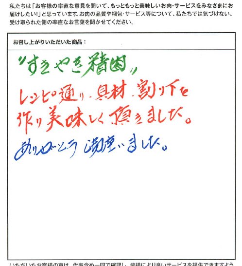 "すきやき精肉"レシピ通り、具材、割り下を作り美味しく頂きました。ありがとう御座いました。