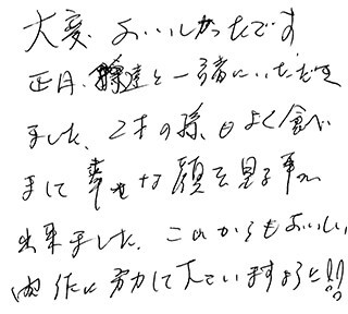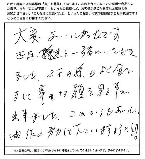 大変美味しかったです。正月孫達と一緒にいただきました。2才の孫も良くたべまして幸せな顔を見る事が出来ました。これからも美味しい肉作りに努力してくださいますように!!