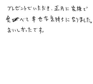 ジューシーでとても美味しかったです。年納めにいただきました。良いお正月を向かえる事ができました。
